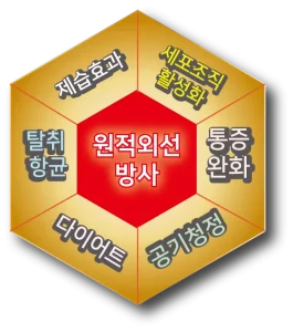 또한, 원적외선은 각종질병의 원인이 되는 세균을 박멸 시켜 숙면, 탈취, 방균, 곰팡이 번식방지, 제습, 공기정화 등에 효과가 있어 침구류, 의료기구, 찜질방, 주택 및 건축자재 등의 여러 분야에 사용되고 있습니다.